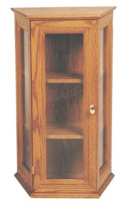 Solid oak with glass panels and adjustable wood or glass shelves, brass lock.