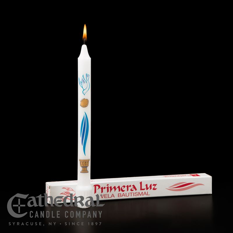 Primera Lux Baptismal candles with Spanish packaging. Size of candle is 3/4″ x 9-1/4″H.