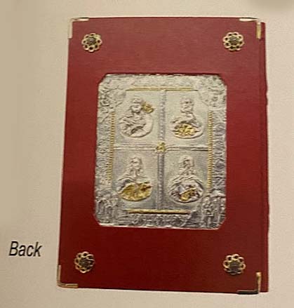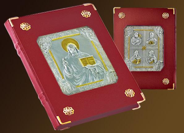 This leather Book of the Gospel Cover has religious icons of Christ the Teacher on the front, and of the Four Evangelists on the back. Decorative rosette accents and protective end caps adorn all four corners of the front and back of the Gospel cover. Black vinyl storage case is included.