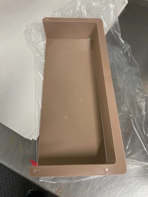 Dark tan plastic book rack shown in picture two. Same as what is shown in picture one, but polypropylene plastic is used. The tan color blends with most pew finishes. These racks do not offer a see-through feature, but still provide a pew rack of strength and quality. They are injection molded using the same dies as the RU125 clear model.