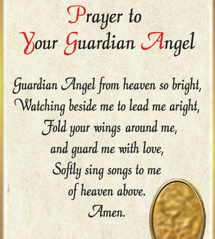 Prayer reads: Guardian Angel from heaven so bright, watching beside me to lead me aright,
