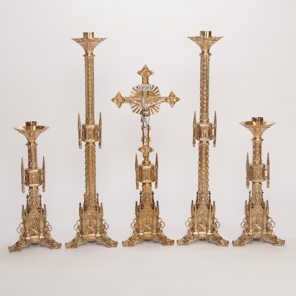 Traditional Gothic Style Altar Crucifix and four Candlesticks are sold as a set or individually.