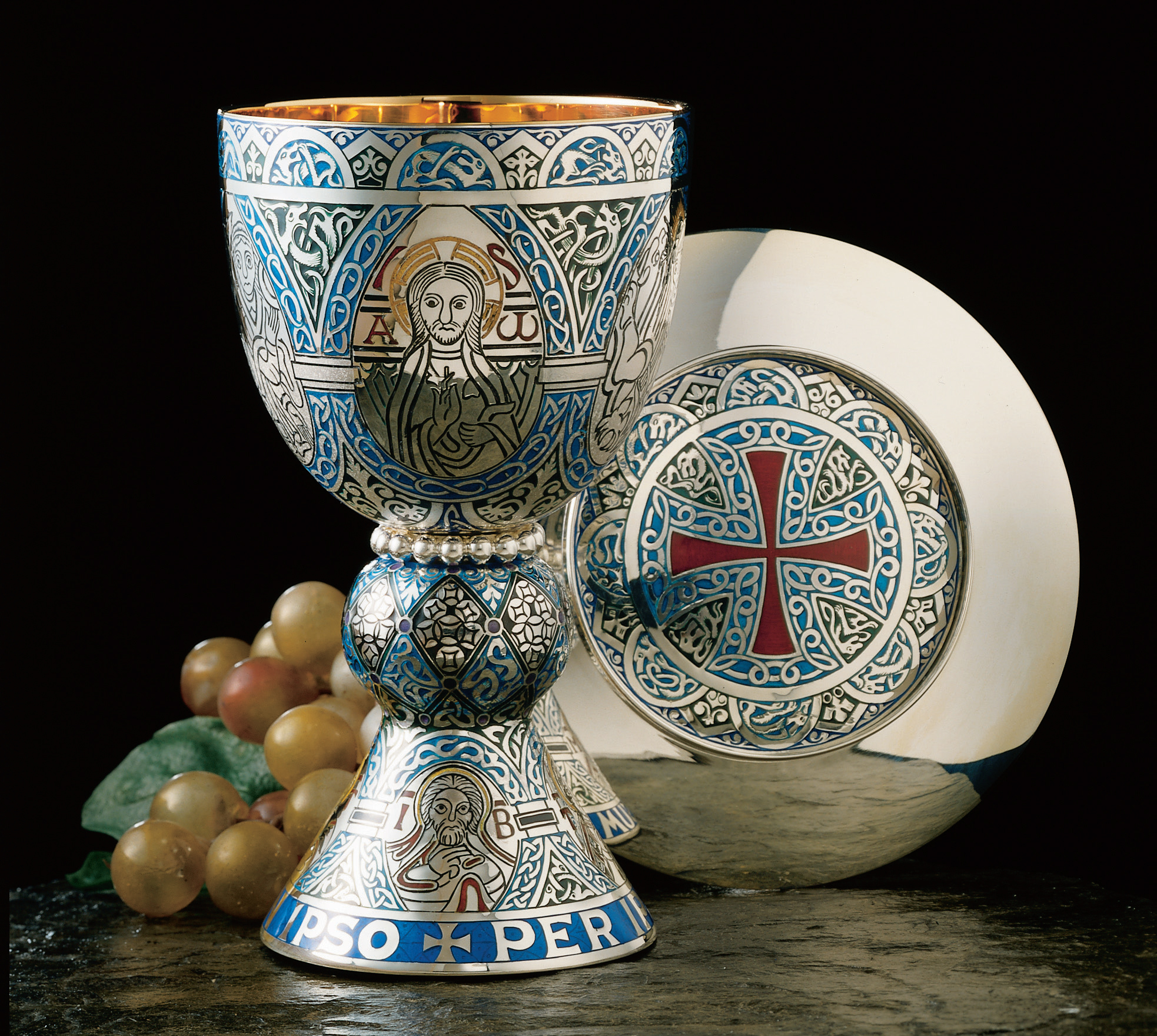 It features The Messiah and the Four Evangelists on the cup with the inscription in Latin “Per Ipsum, Cum Ipso, In Ipso” (For Him, With Him, In Him) on the base.