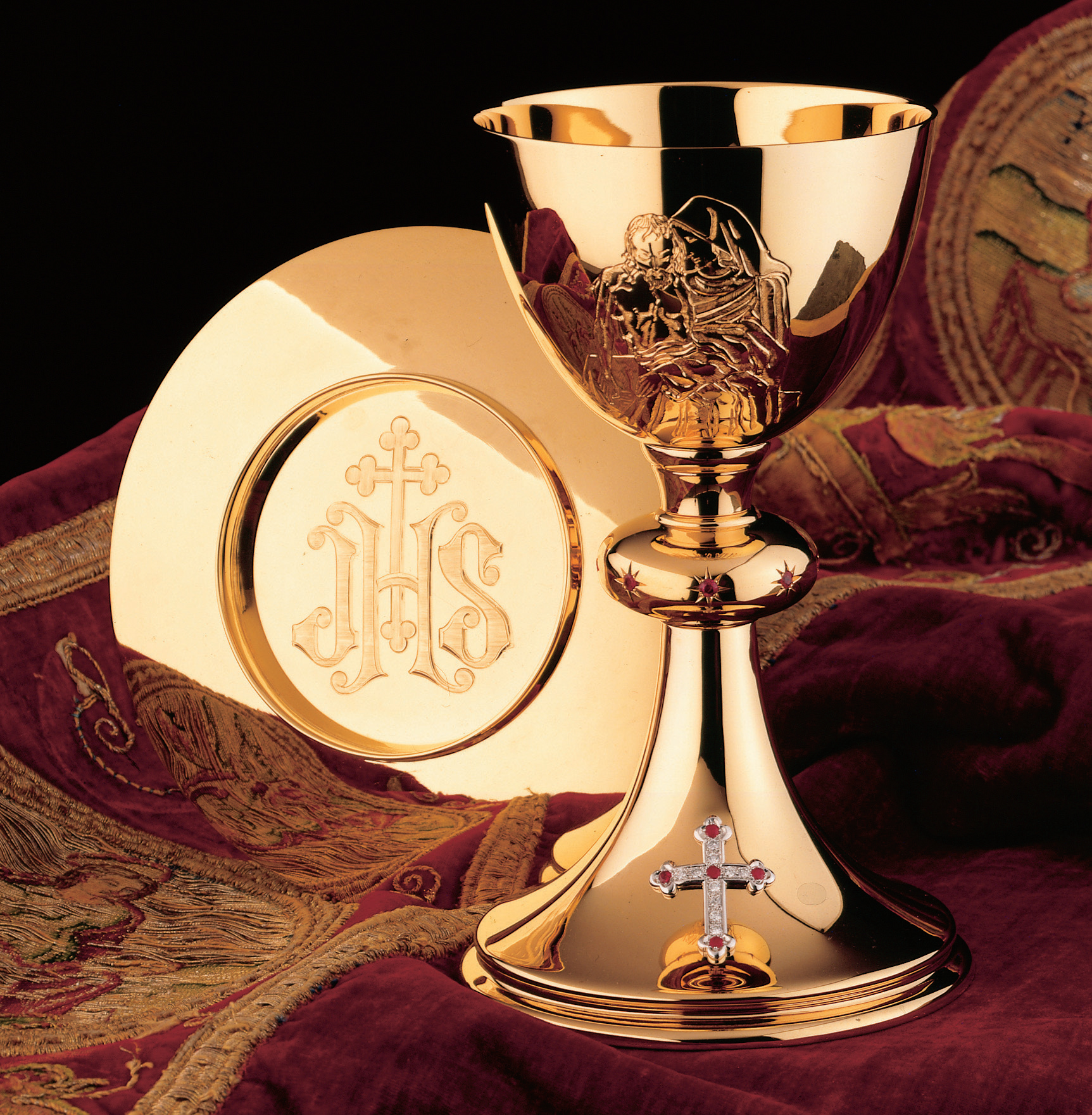 Available in 925 sterling silver, 24 K gold plate with optional 20 K gold cup or 20 K solid gold overall. The cross on the base is adorned with precious gems (diamonds and rubies) while the node is imbedded with 8 rubies. The cup depicts “The Piety” completely hand engraved. (Different motifs or images available on request).