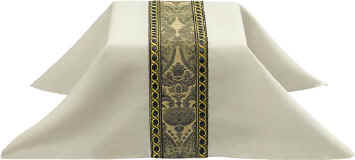 Green and gold galloon with Roncalli tapestry on cream Abbey unlined fabric.