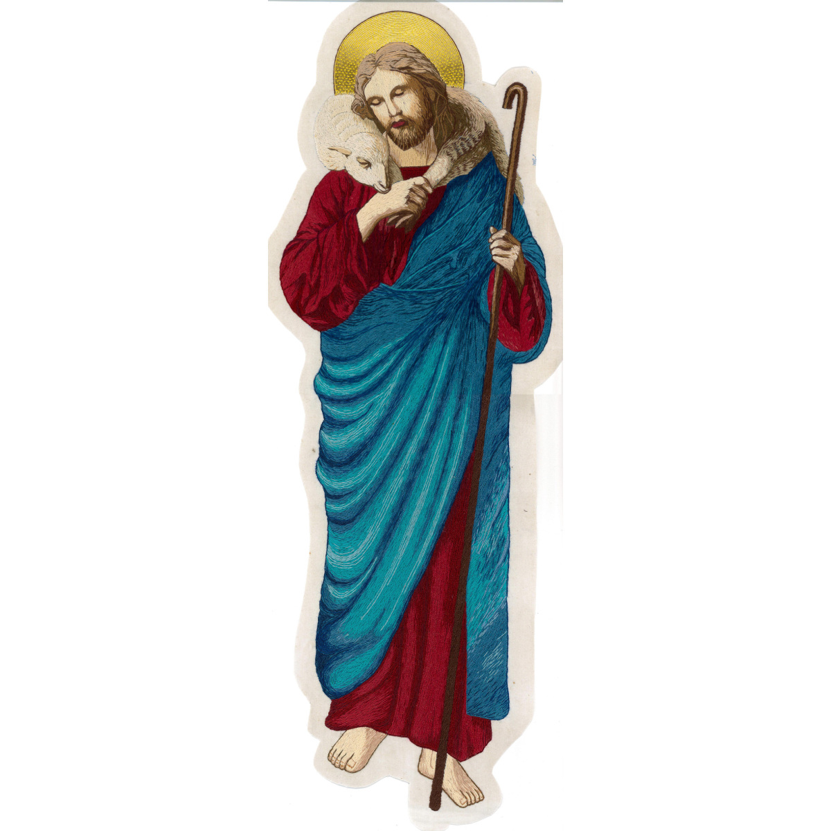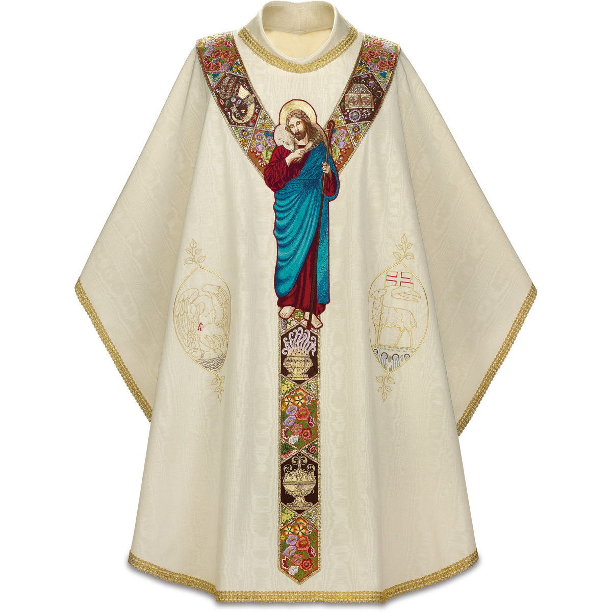Chasuble with hand embroidered bandings of the “Good Shepherd” and machine embroidered emblems of the Pelican and the Lamb of God. Finished with gold braid. Made in Moiré fabric – 55% cotton and 45% man‑made fibers. Chasuble has a stiff roll collar “4”. Width 160 cm (63″), length 135 cm (53″); with inside stole.