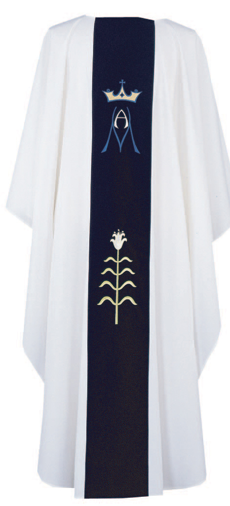 Pure white, machine washable, amply cut chasuble, wrinkle resistant polyester.