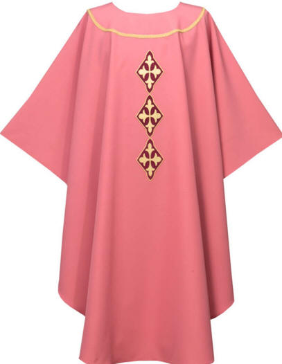 Rose chasuble with three embroidered crosses on front and one embroidered cross on back.