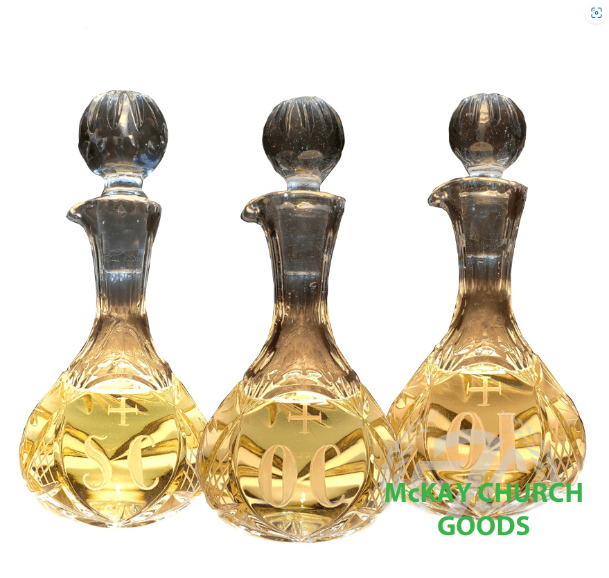 This glass Chrismatory Set comes with the three oil stocks, OC, OI, SC.