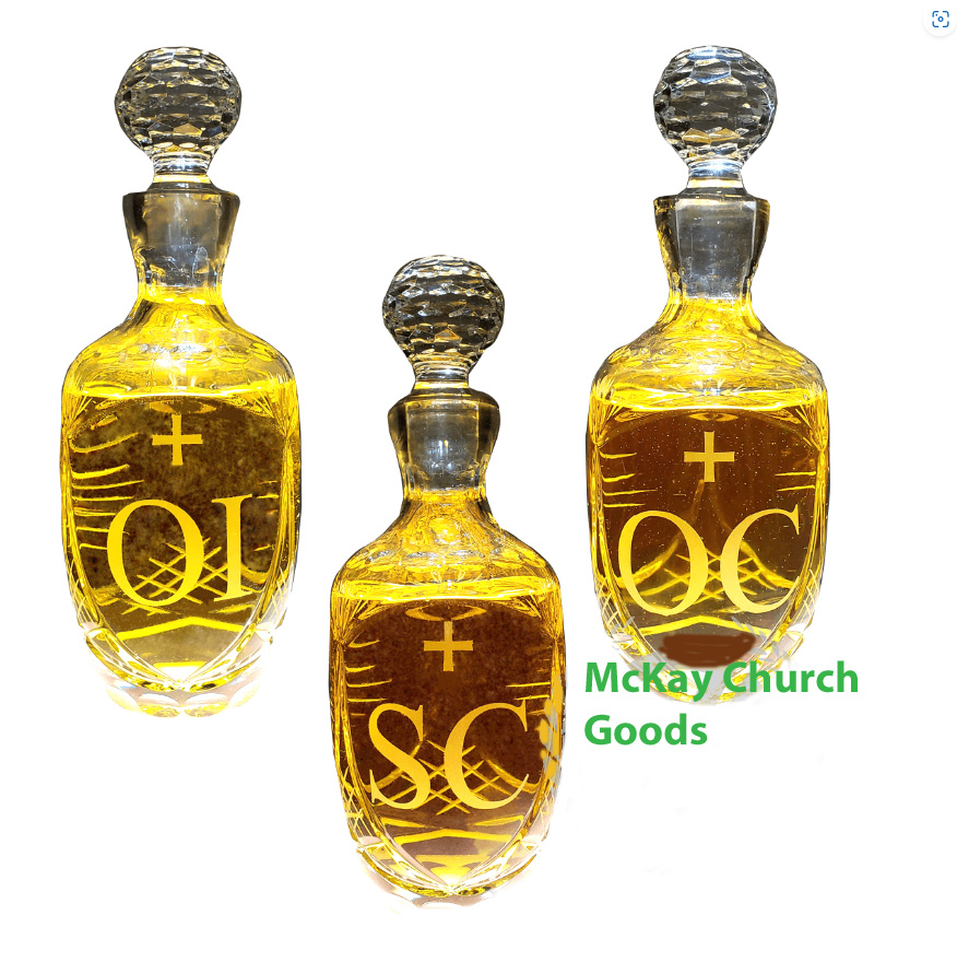 This glass Chrismatory Set comes with the three oil stocks, OI, OC, SC.
