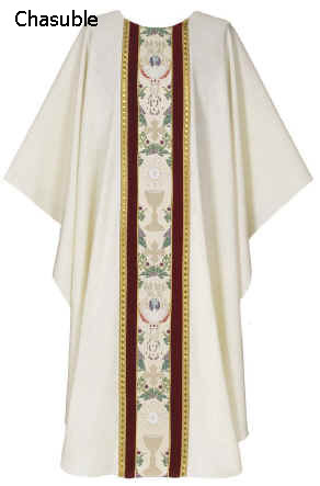 Matching chasuble has design on both sides. Standard size 57″ x 51″L or ample 64″W x 52″L.