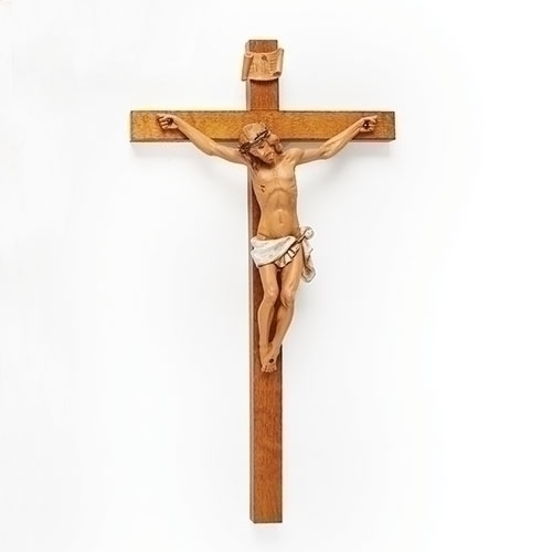 15″ Wood tone crucifix, polymer corpus on wood cross, boxed.