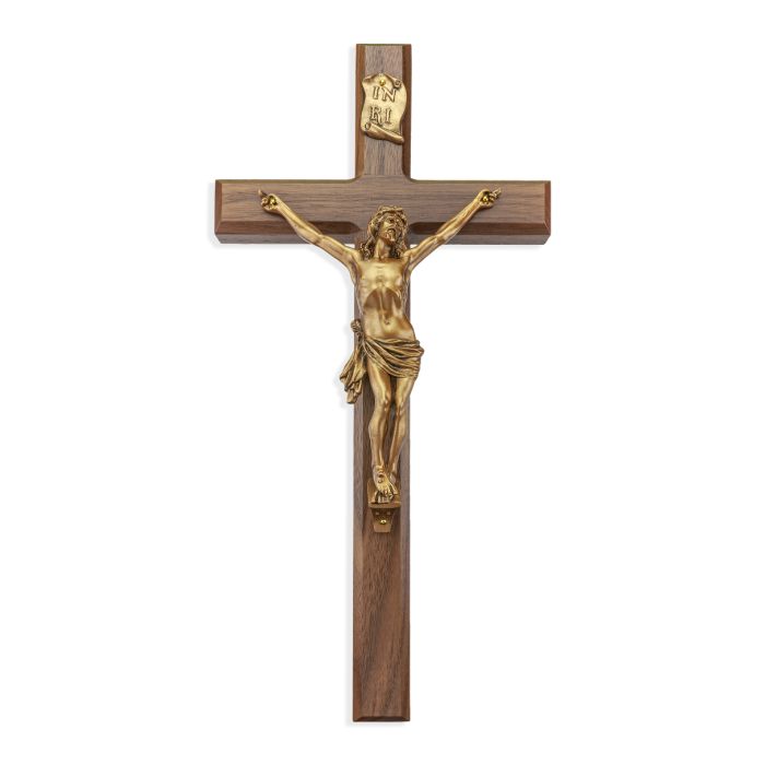 15″ Walnut cross with antiqued gold finish pewter Corpus.