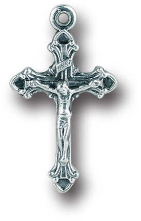 This is a small .75″ metal silver oxidized Crucifix with a loop at the top.