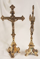 A double sided standing Crucifix in shiny brass with a three-point base, 13″H.