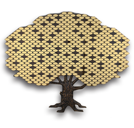 Each tree is fabricated with an acrylic background that is laser cut and drilled. Metal leaves in your choice of brass, silver, bronze or green are screw mounted with self-tapping screws for easy updating. Each color can be used to acknowledge a level of giving on the tree, affording the Church the opportunity to maximize their investment. Our trunk is a 1” thick detailed, dimensional casting in a warm bronze color metal for a life time of durability.