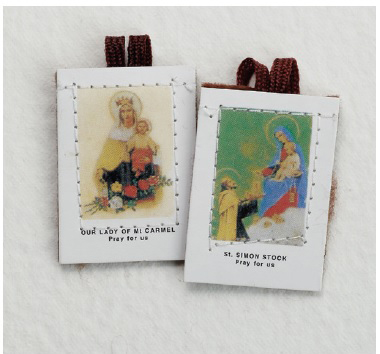 Felt Scapular is 1-1/4″ x 1-1/2″H. Has brown string cord. Price is for 25 Scapulars.