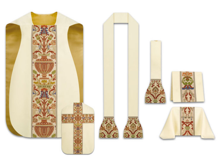 Set includes lined chasuble with stole, maniple, burse and chalice veil.