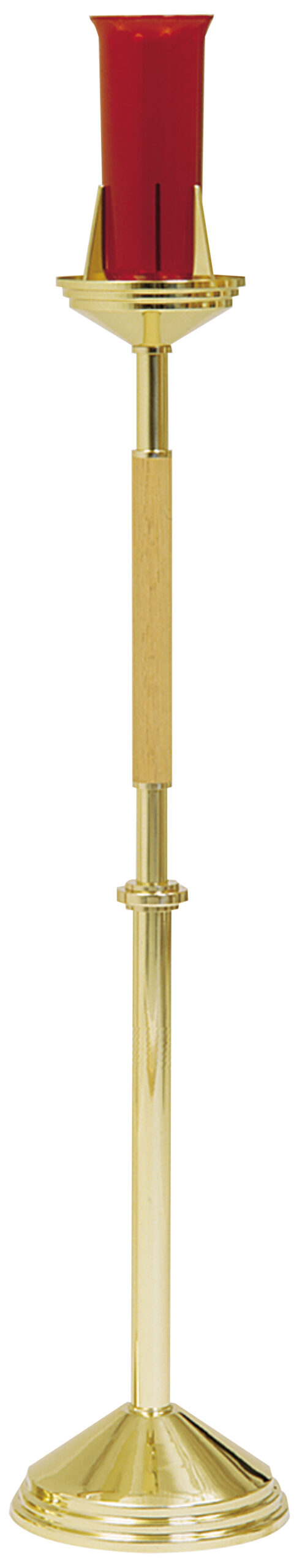 Solid brass and oak wood. 46″H. to bobeche, 10-1/2″ base. 8-day glass sold separately.