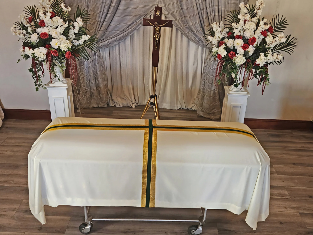 Very elegant chasuble and funeral pall. Prabhu (Poly/Viscose) base with gold lame galloon and green velveteen. Funeral pall is available in either 6-foot x 10-foot or 8-foot x 12-foot size. Matching chasuble is also available. Other velveteen colors available are maroon and purple. Inquire by email for matching vestments, lectern hangings, stoles, dalmatics, etc.