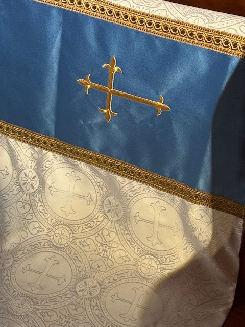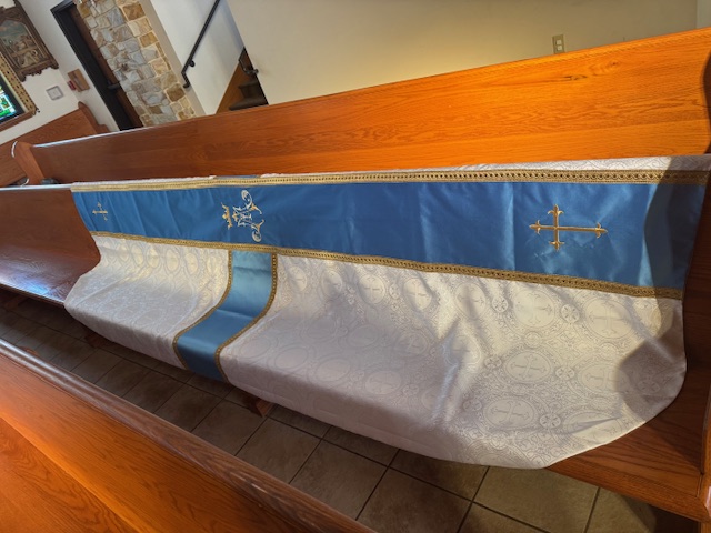 It has a A/M Marian symbol on the center panel and two embroidered crosses on each end.