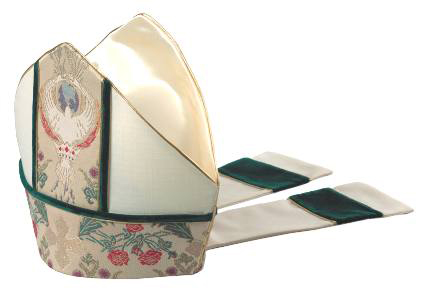 Mitre measures 10″ high. Please specify head circumference in the special instructions section of our shopping cart.