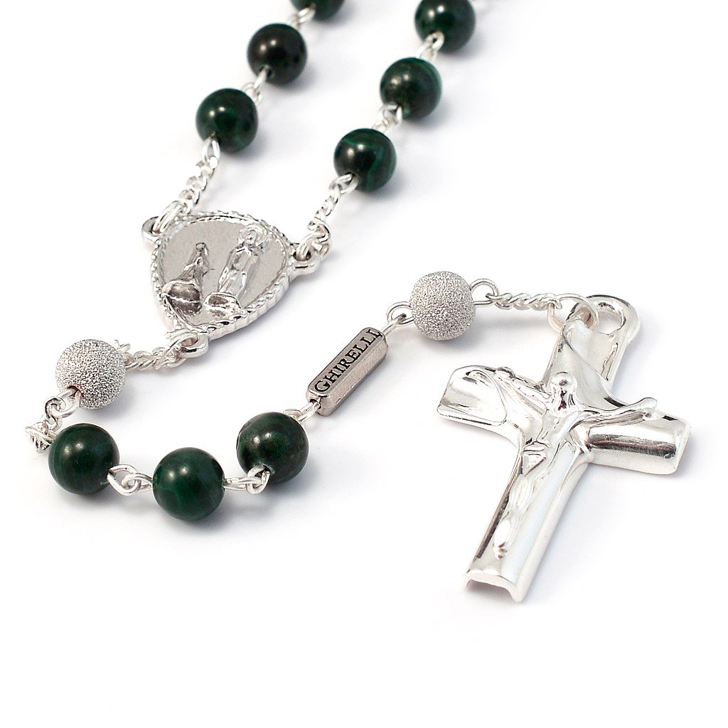 6 mm semi-precious stone beads – Malachite – 6 mm Our Father beads in full Sterling Silver, diamond cut, thick rhodium plated – Finish in 925/°°° Sterling Silver 0.60 mm wire, thick rhodium-plated, diamond-cut “gourmette” chain 925/°°° Sterling Silver, 0.50 mm thick rhodium-plated, Ghirelli brand plate in Zamak alloy – Centerpiece featuring the Lourdes Apparition within a cord-like frame in 925/°°° Sterling Silver thick rhodium plated – Crucifix featuring an innovative minimalist design, sober and elegant at the same time in 925/°°° Sterling Silver, thick rhodium plated.