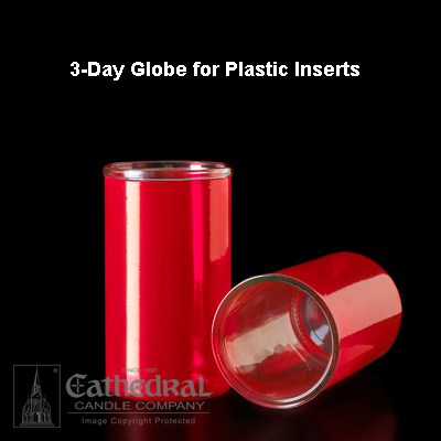 Globes for 3-Day Candles are 5″ Ht. with 3″ top outer diameter, 2-1/2″ inside diameter and 2-15/16″ bottom outer diameter.