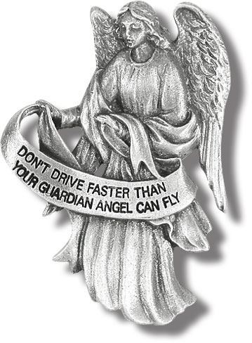 Guardian Angel visor clip is hand engraved genuine pewter with an antique finish.