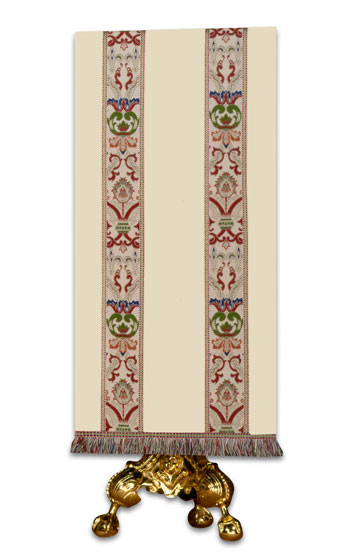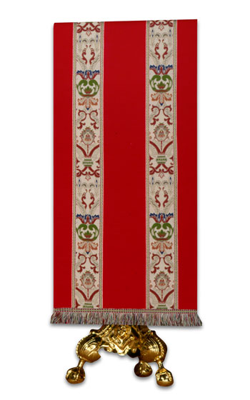 Lectern or ambo cover in Dupion fabric (70% man-made fibres and 30% viscose), with Regina multi-colored orphreys. Available colors are red, beige, dark green or purple.