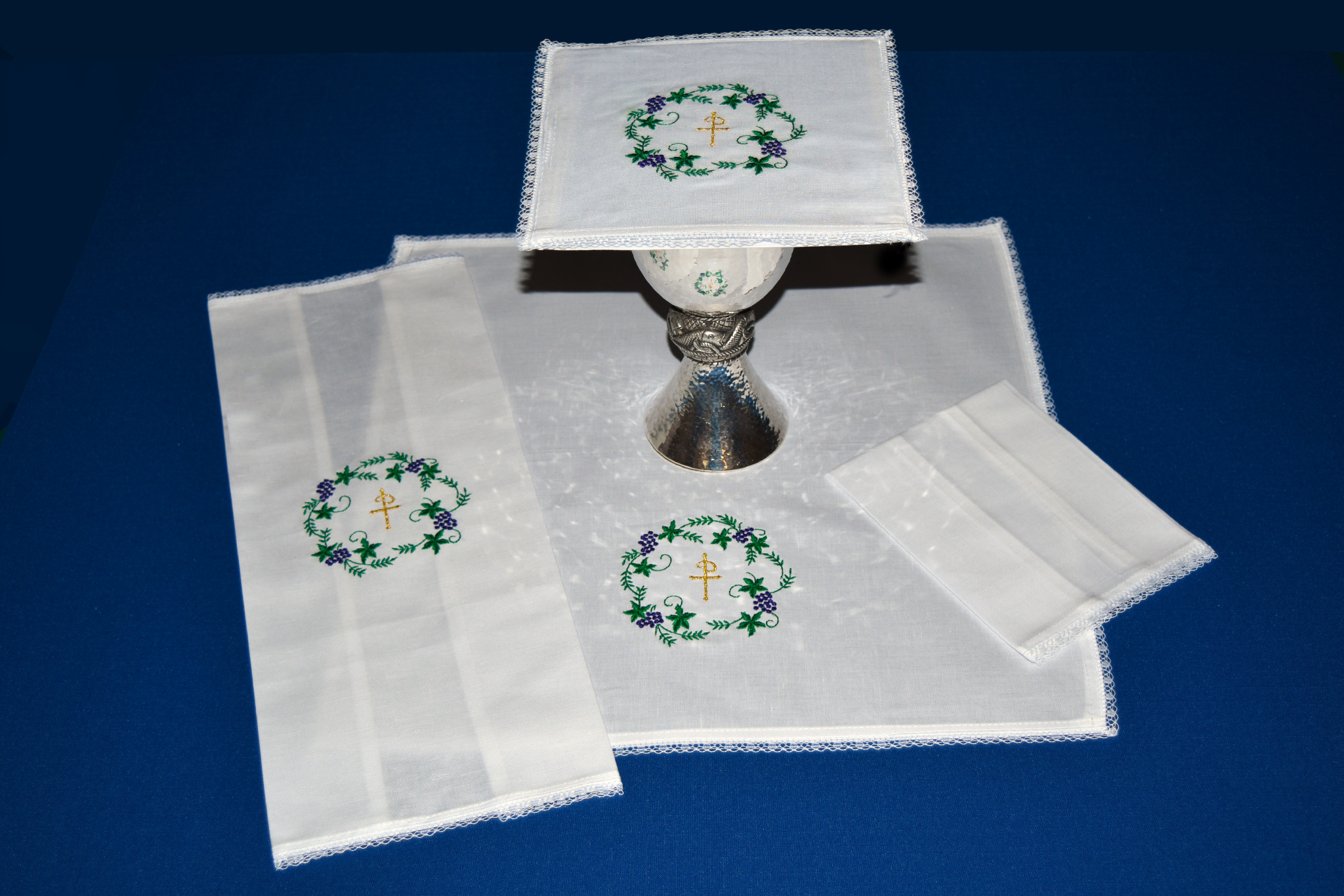 Complete set includes embroidered pall cover with insert, purificator, corporal and plain finger towel.