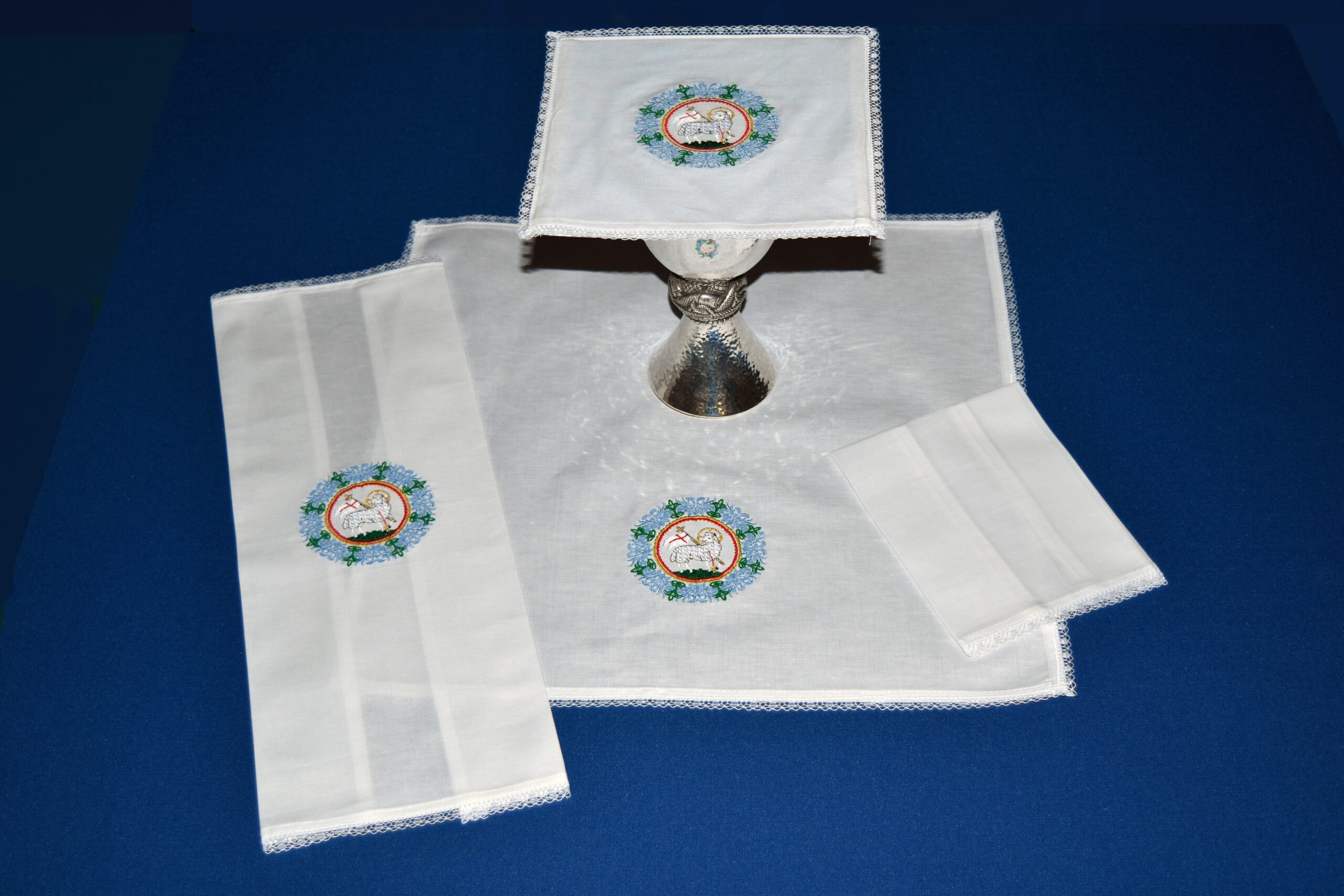 Complete set includes embroidered pall cover with insert, purificator, corporal and plain finger towel.