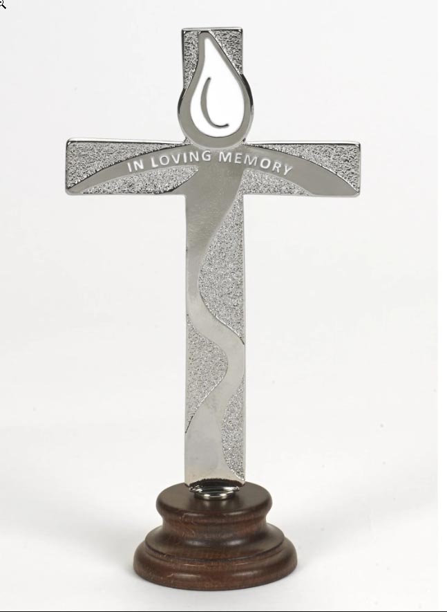 Silver tone 5-12″ Cross with White Enameled “In Loving Memory” and Tear Drop.