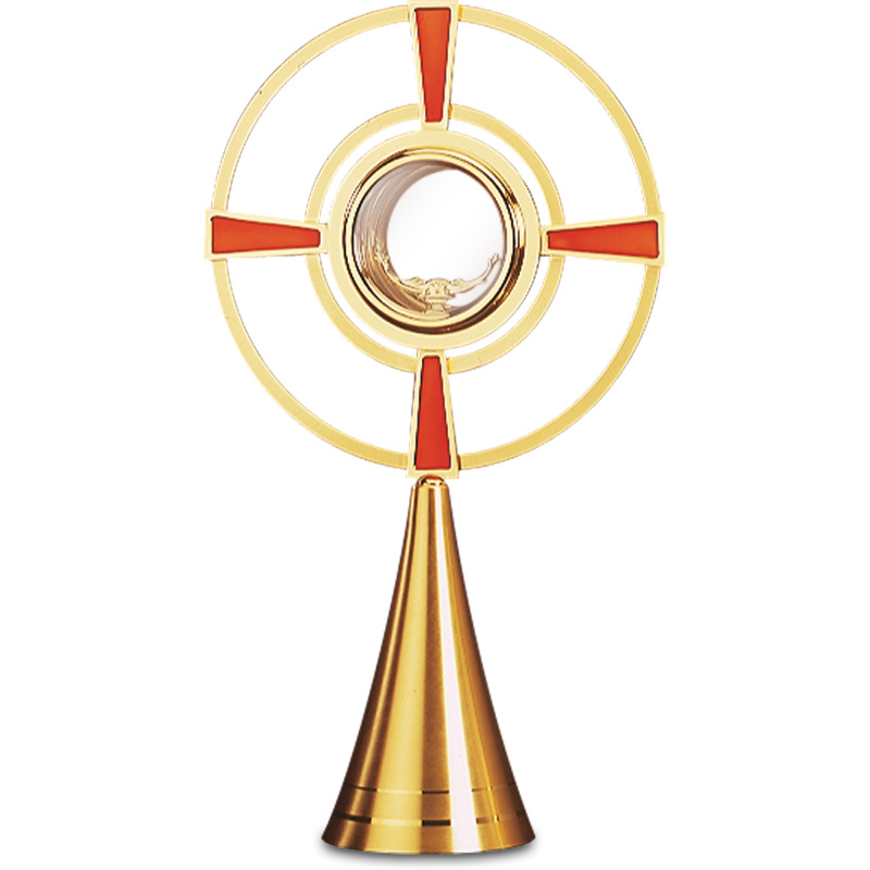Monstrance with cross in epoxy enamel and removable lunette. Height 15″ = 38,2 cm. Will hold hosts up to 2-11/64″ or 5.5 cm. Please specify church name, address and 9-digit Federal Tax ID number in the special instructions section as you check out.
