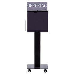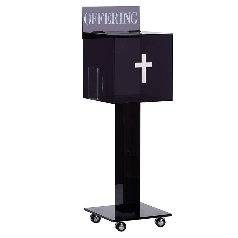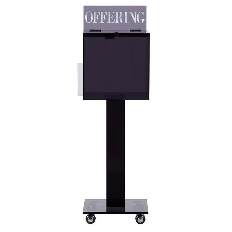 Floor Donation Box comes with locking casters, standard, and includes a removable OFFERING sign, as well as an adhesive white acrylic cross for the front panel. Choose to use it for offerings, donations, or special fund-raisers.