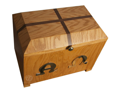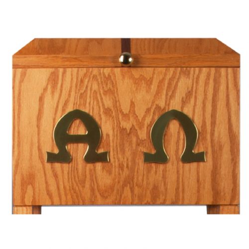 Light oak finished wood, high polish brass knob and Alpha Omega symbols, lined inside.