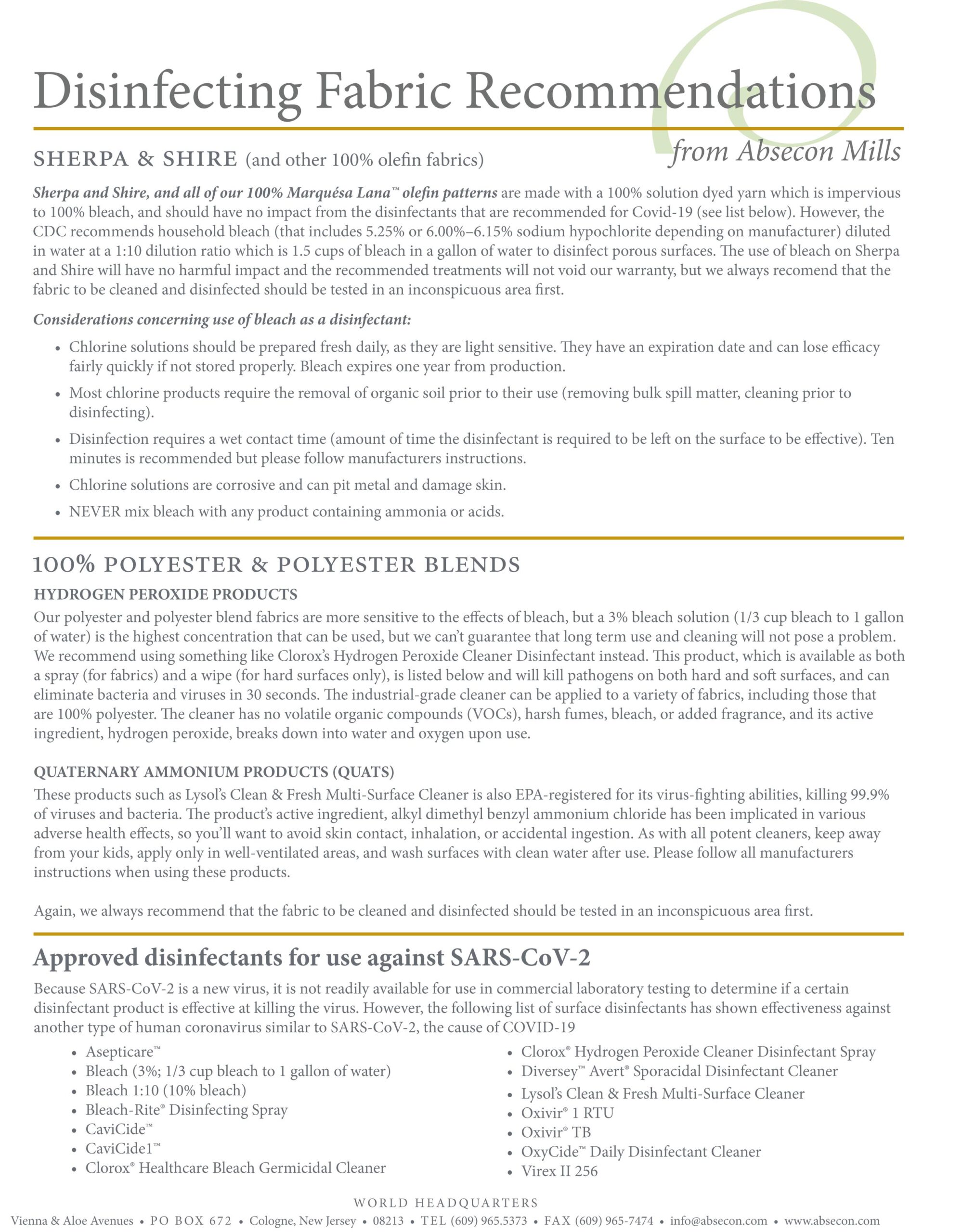 Also shown is a document from Absecon Mills (the supplier of Sherpa/Shire fabric, among others) showing their recommendations for disinfecting against Covid-19.
