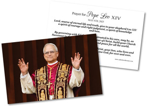 The 2.5″ x 4.25″ holy card features an image Pope Leo XIV on the front and a prayer on the back.
