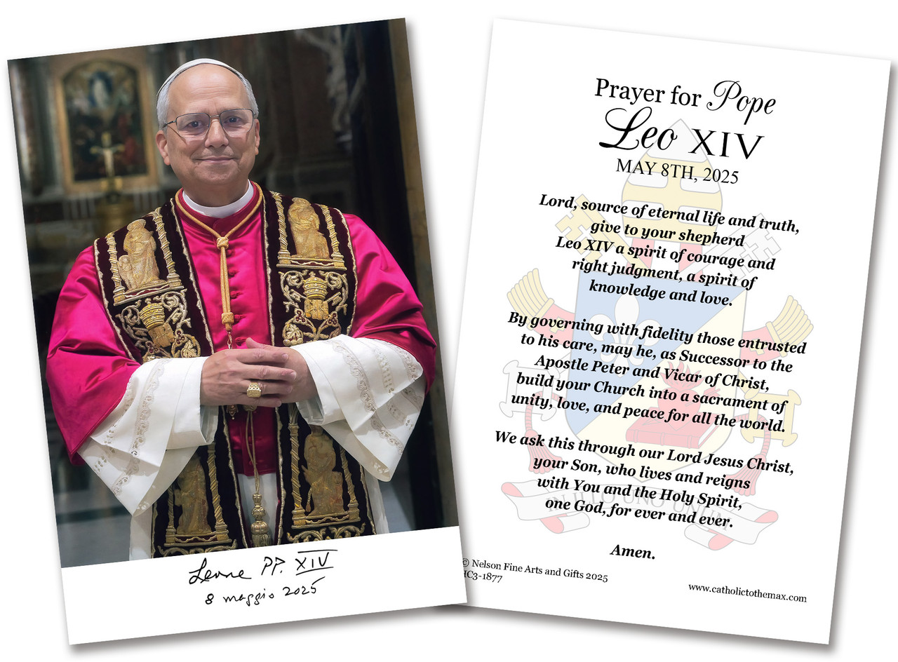 The 4″ x 6″ holy card features an image Pope Leo XIV on the front and a prayer on the back.