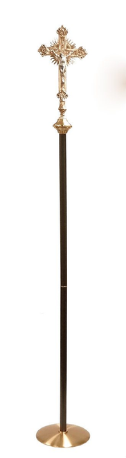 This processional crucifix brings beauty and quality to the liturgical experience. Raise this beautiful processional Crucifix to begin the celebration of the Mass in your church. The Crucifix, measuring fifteen inches high, features a six-inch Corpus on a budded cross with a node at the transition to the shaft. The shaft measures eighty-eight inches high with a durable black and gold vein powder-coat finish. The Crucifix rests on a weighted brass base measuring twelve inches in diameter.