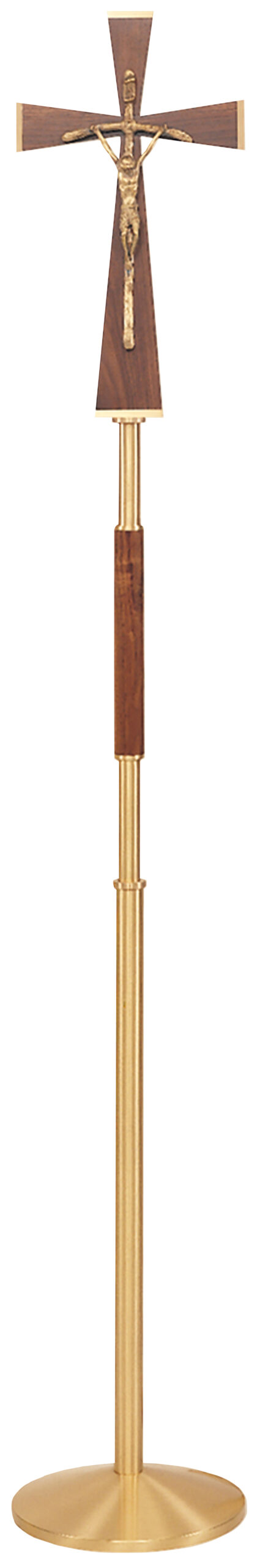 12″ bronze crucifix mounted on 20″ walnut cross, with satin bronze tips. 12″ walnut insert on staff.