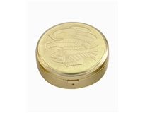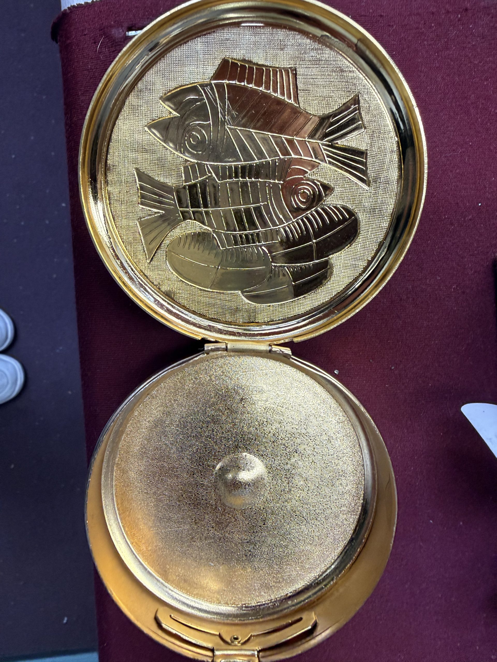 #3253G/G – Green Pyx with Fish 3-3/8″ x 1-1/4″, 45 Host, Made in Europe.