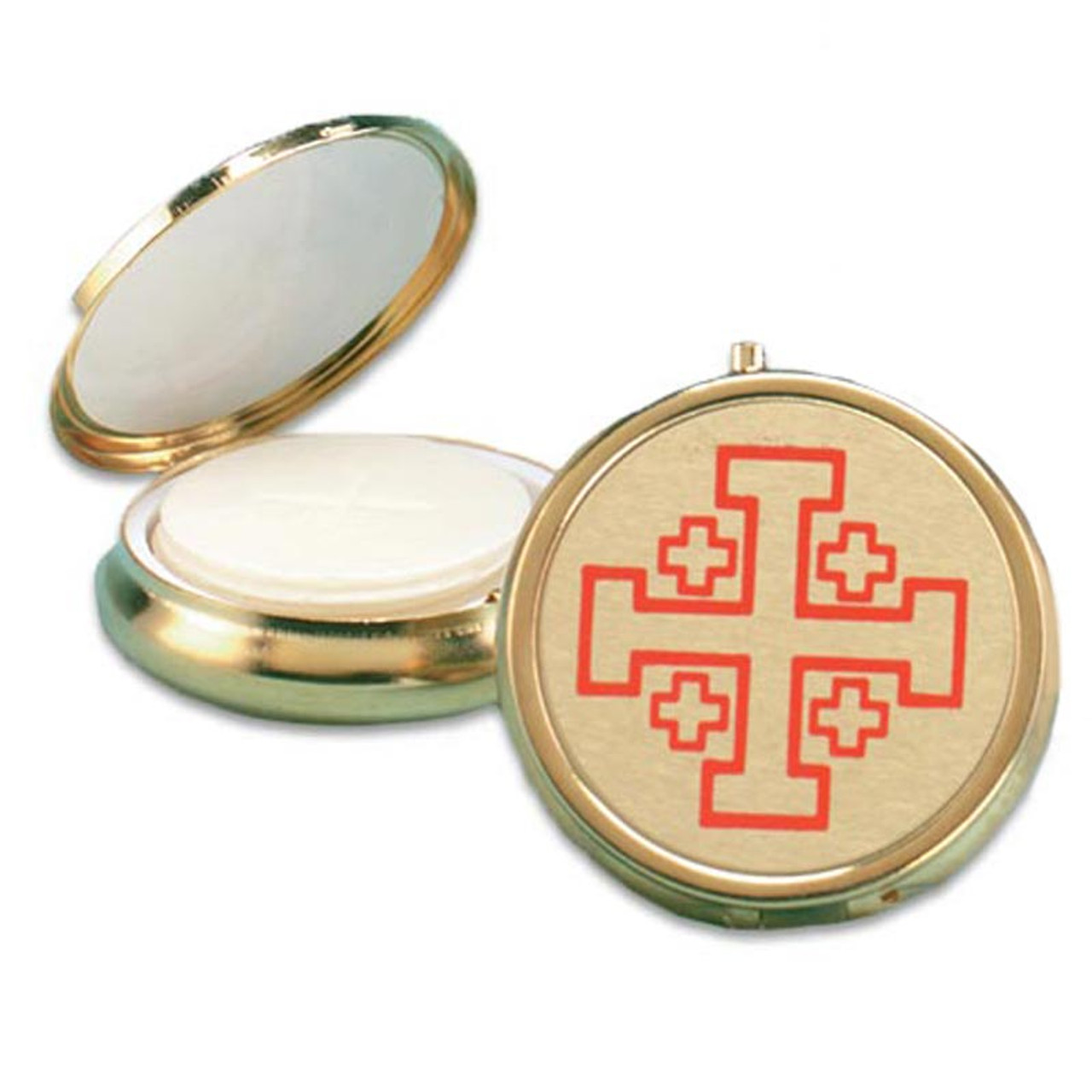 This pyx with a stunning Jerusalem Cross design can hold 7 hosts.