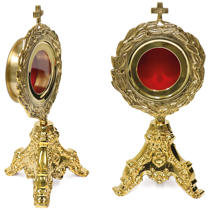 Reliquary is brass, polished and varnished (maintenance free), height 26 cm (10″), dia. 12 cm (46/8″). Please specify church name, address and 9-digit Federal Tax ID number in the special instructions section as you check out.