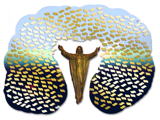The Resurrection Wall consists of 2 acrylic laser cut and laser drilled panels with a subtle scenic background laminate to the reverse side. The gold plaques are mounted on the front side of the acrylic panel. Each of the two panels measure 30” wide x 60” tall. The curvature of the two panels form a frame around a 36”x 36” bronze color statue of Christ.