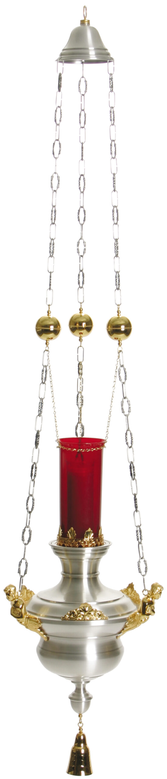 Hanging Sanctuary lamp is antique silver with a 24k gold plated trim.