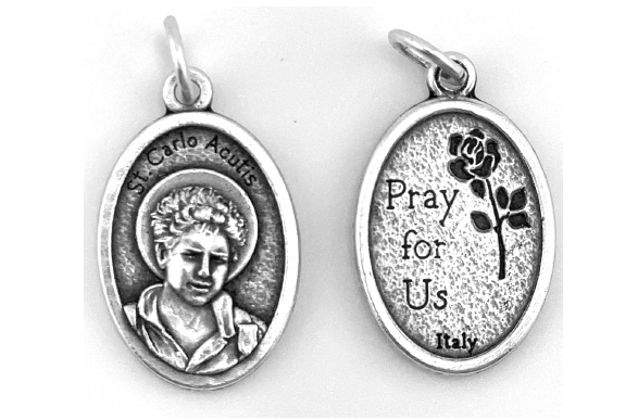 St. Carlo Acutis medal has Saint on front and Pray for Us on back.