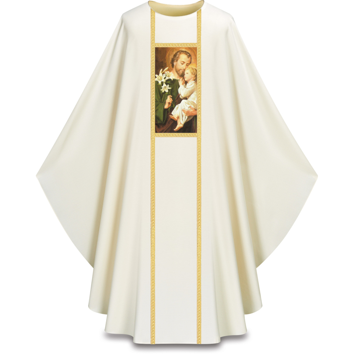 Has printed image of St. Joseph and gold braid. Size of chasuble is 53″ long and 63″ wide.