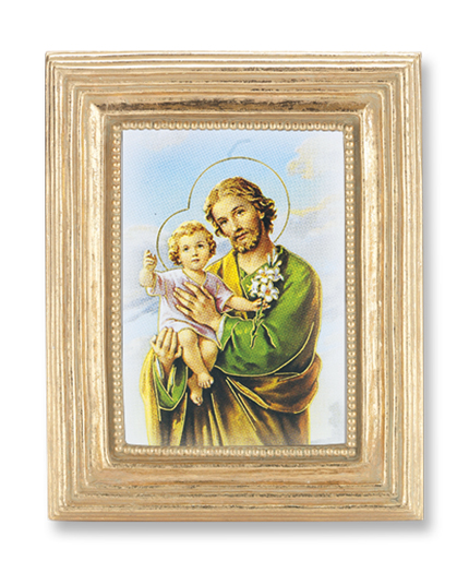 St. Joseph Gold Stamped Print under Glass in a Gold Leaf Frame.