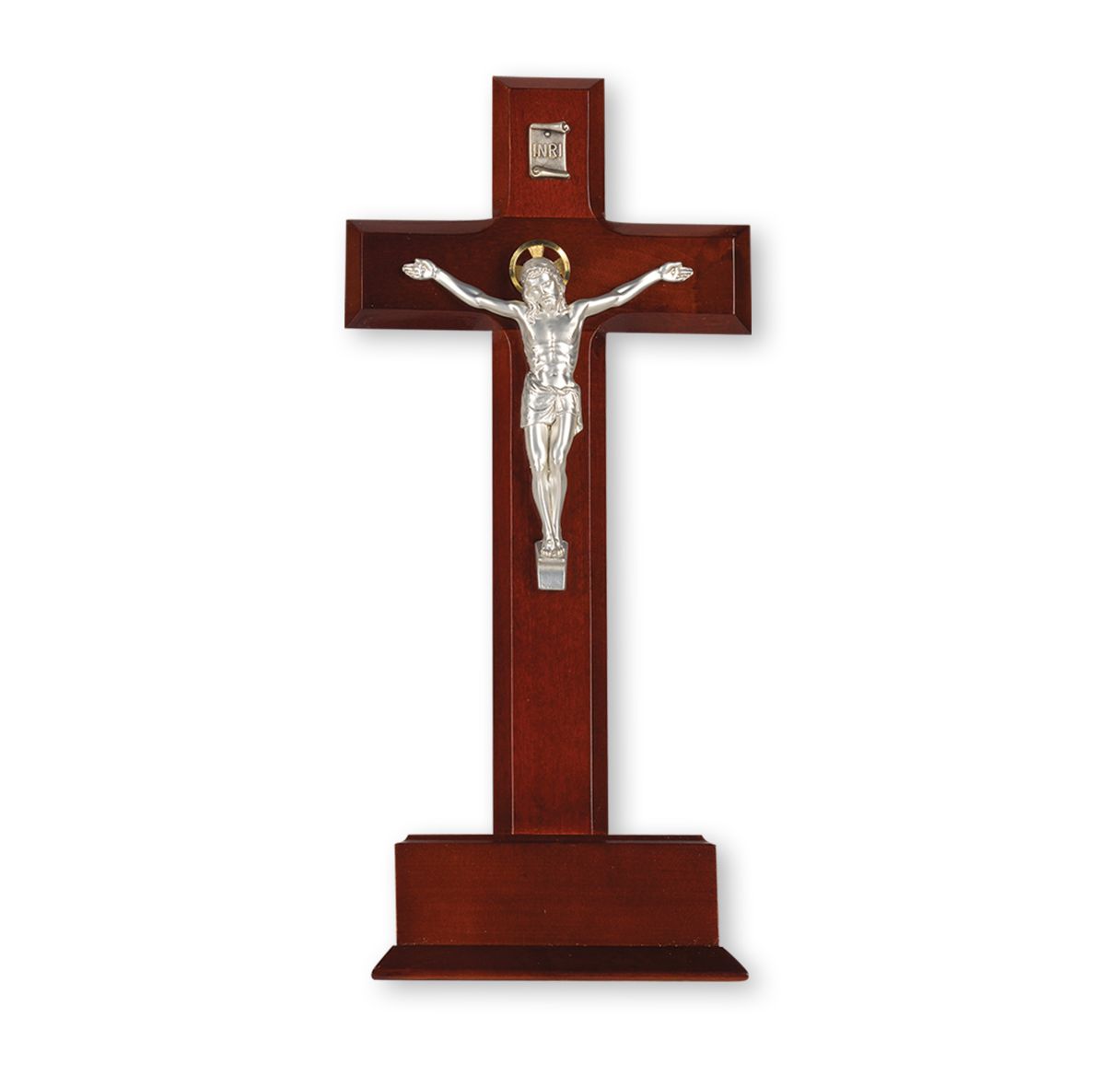 10″ Standing Dark Cherry Wood Cross W/Silver Corpus